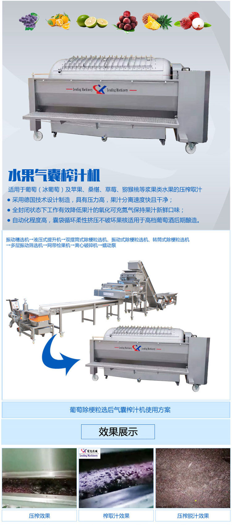该机采用德国技术精心设计制造而成,具有压力高,果汁分离速度快且干净,性能稳定等特点。可适用于葡萄(冰葡萄及苹果、桑椹、草莓、猕猴桃等浆果类水果的压榨取汁,较高工作压力2bar,气囊采用德国原装进口。